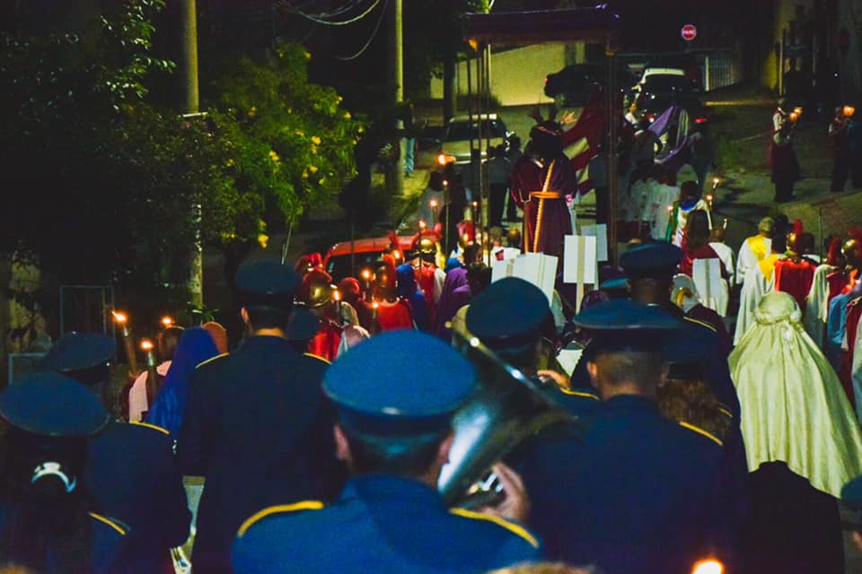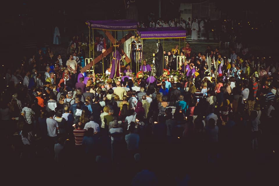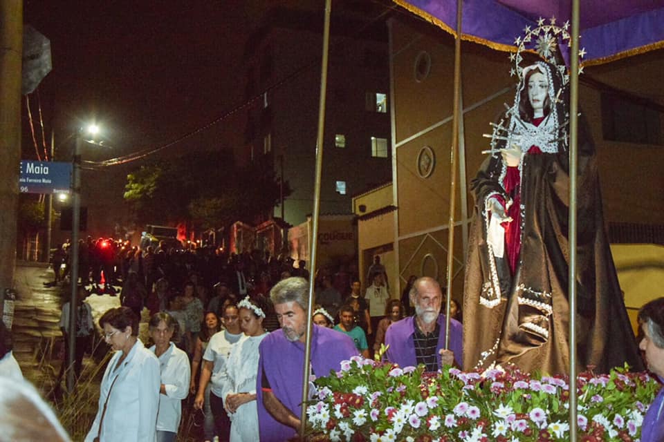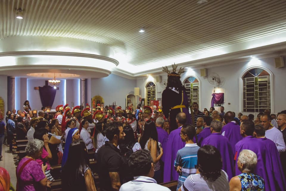 A Semana santa foi marcada por momentos solenes de muita oração, iniciando com o Ofício de Trevas celebrado às 19h na Segunda e Terça-feira Santas, 'A celebração teve início às 19H, durante a cerimônia, os últimos passos de Cristo são simbolizados pelas velas que são apagadas aos poucos. Apenas uma permanece acesa, para lembrar a fé na ressurreição. A cerimônia do Ofício de Trevas é composta por um conjunto de leituras, lamentações, salmos e preces penitenciais, onde o templo fica às escuras, representando o luto e a escuridão à qual ficou a Terra pela morte de Jesus.', sempre seguida da Santa Missa. Após a Santa Missa da Segunda-feira Santa foi realizada a solene procissão do depósito com a Imagem de Nossa Senhora das Dores até a Comunidade Nossa Senhora Aparecida e na Terça-feira Santa a solene procissão do depósito com a Imagem de Nosso Senhor dos Passos até a comunidade Santa Luzia, em ambas animada pela banda de Música Santa Cecília de Caeté.