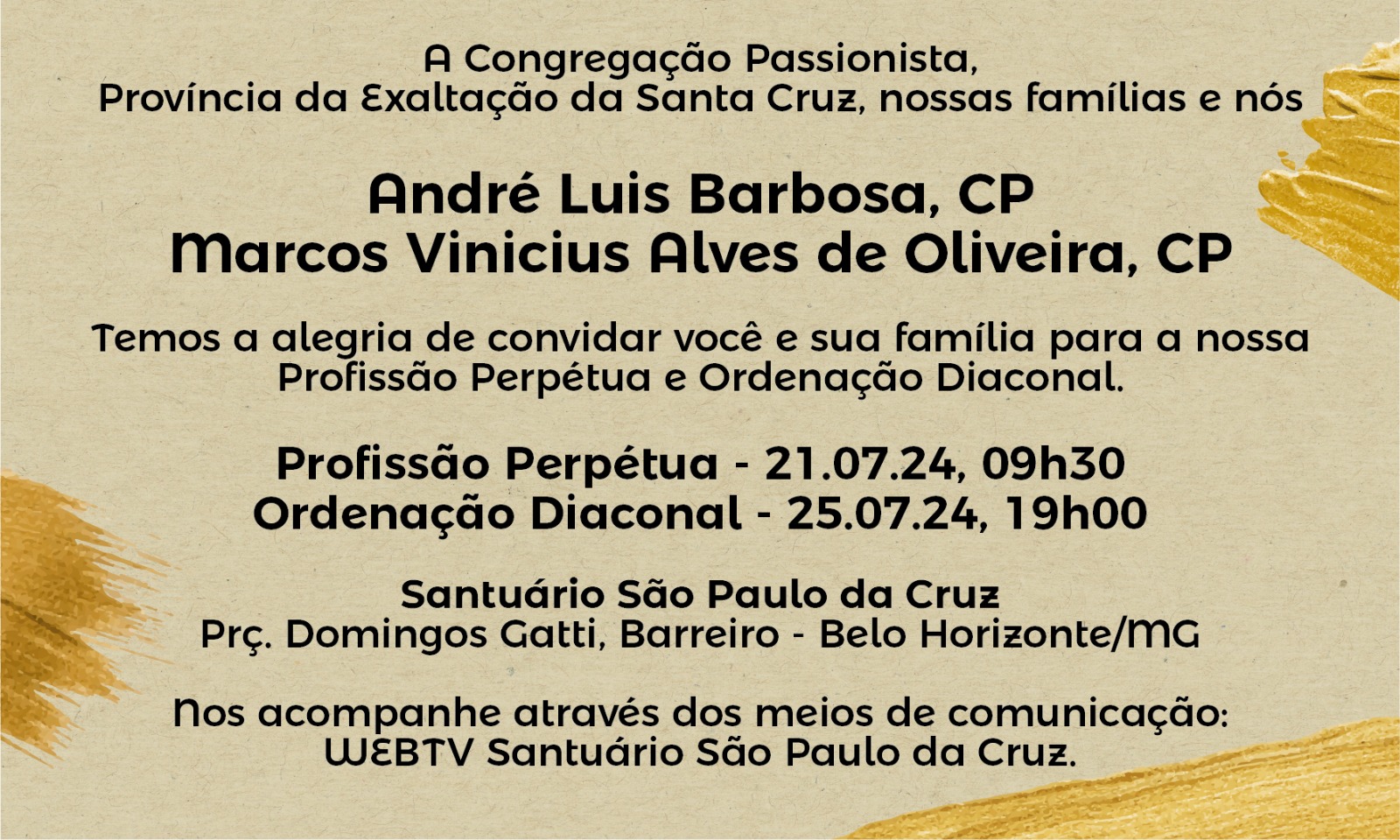 A Congregação da Paixão de Nosso Senhor Jesus Cristo, Província Exaltação da Santa Cruz, tem a alegria de convidá-los para as Celebrações Eucarísticas nas quais os Religiosos André Luis Barbosa, CP, e Marcos Vinicius Alves de Oliveira, CP, professarão os seus Votos Perpétuos e serão Ordenados Diáconos pela Oração da Igreja e Imposição das Mãos de Dom Nivaldo dos Santos Ferreira, Bispo Auxiliar da Arquidiocese de Belo Horizonte/MG.