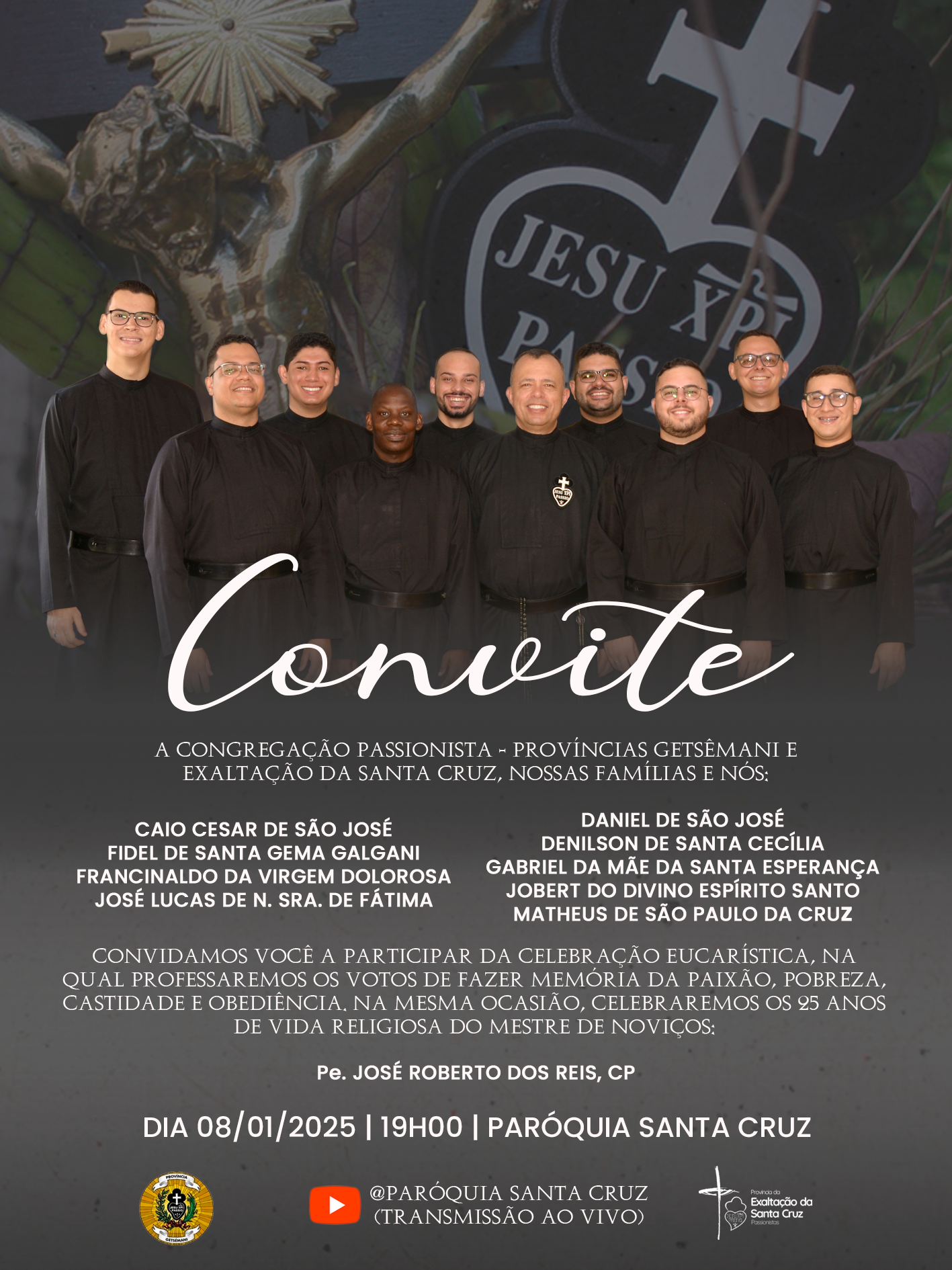 A Congregação da Paixão de Jesus Cristo, Província Exaltação da Santa Cruz, tem a alegria de convidá-los para a Celebração Eucarística na qual os Noviços do ano de 2024 emitirã seus Primeiros Votos Religiosos na Congregação da Paixão de Jesus Cristo (Passionistas). Nesta mesma ocasião, celebraremos com muita alegria os 25 anos de Profissão Religiosa do Padre José Roberto dos Reis, CP, Mestre de Noviços.